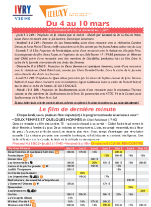 Le film de dernière minute, avec une nouvelle rencontre !Semaine du 4 au 10 mars DEUX FEMMES ET QUELQUES HOMMES de Chloé Robichaud (1h40) Dans ce...