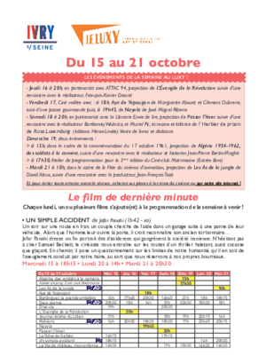 Le film de dernière minute !Semaine du 15 au 21 octobre • UN SIMPLE ACCIDENT de Jafar Panahi (1h42 - vo) Un soir sur une...
