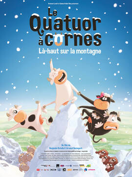 Après leur périple qui les a menées à la mer, quatre vaches fantaisistes cheminent maintenant vers la montagne pour découvrir les sommets enneigés.