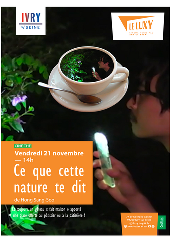 Ciné théCe que cette nature te dit : Hong Sang-Soo au ciné théVendredi 21 novembre à 14hLe ciné thé, c'est une projection suivie d'un échange autour d'une tasse de thé, d'un café, voire d'un gâteau. Car la place est offerte au pâtissier ou à la pâtissière qui apporte son gâteau maison !