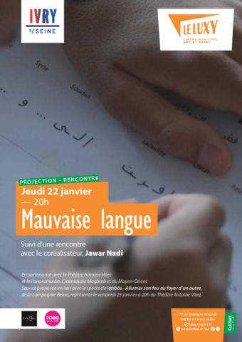 Projection rencontreMauvaise langue : la transmission impossible ?Jeudi 22 janvier à 20hEn partenariat avec le Panorama des Cinémas du Maghreb et du Moyen-Orient et le Théâtre Antoine Vitez