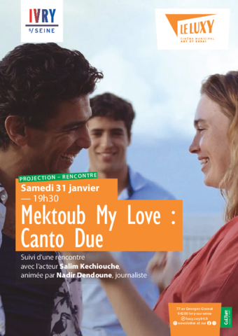 Projection rencontreMektoub My Love: Canto Due : l'appel du destin au Luxy !Samedi 31 janvier à 19h30Le nouveau film d'Abdellatif Kechiche, entre soleil et désir