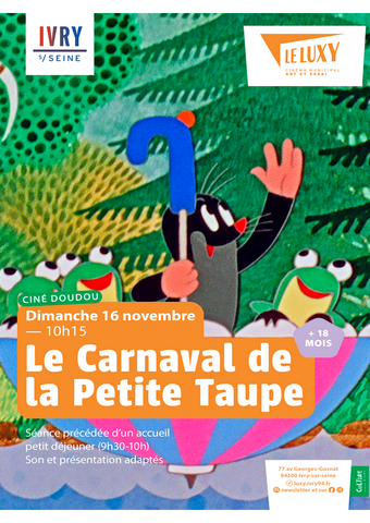 Ciné doudouLe Carnaval de la Petite Taupe : un ciné doudou tout doux !Dimanche 16 novembre à 10h15Le ciné doudou, c'est une séance à partir de 18 mois, avec un niveau sonore et une présentation adaptée !
