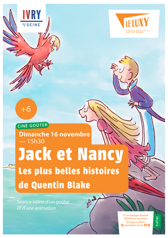 Ciné GoûterJack et Nancy, les plus belles histoires de Quentin Blake : un ciné goûter au goût d'aventure !Dimanche 16 novembre à 15h30Le ciné goûter = film + goûter + animation !