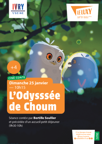 Ciné P’tit Déj’L'Odyssée de Choum : un Ciné-conte irrésistible !Dimanche 25 janvier à 10h15Une matinée féérique, grâce au Ciné-conte de Bertille Soullier !