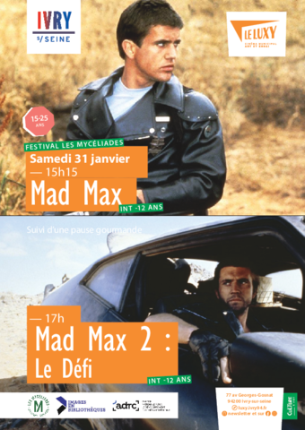 Mad Max : deux fois plus de bitume !Samedi 31 janvier à partir de 15h15Deux films + 1 pause gourmande pour le festival des Mycéliades !